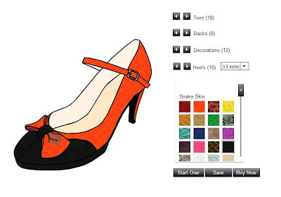E pra completar o visual você pode mandar fazer seu próprio sapato que vai ser único e oiginal: mudando salto, acessórios, fivela, cores, tecido, modelo. É só entrar no site Shoes of Prey e clicar em Get Started. O site é todo em inglês, mas dá pra entender acompanhando as imagens. O básico é escolher o modelo e depois mudar nas setinhas para escolher as cores e tecidos.