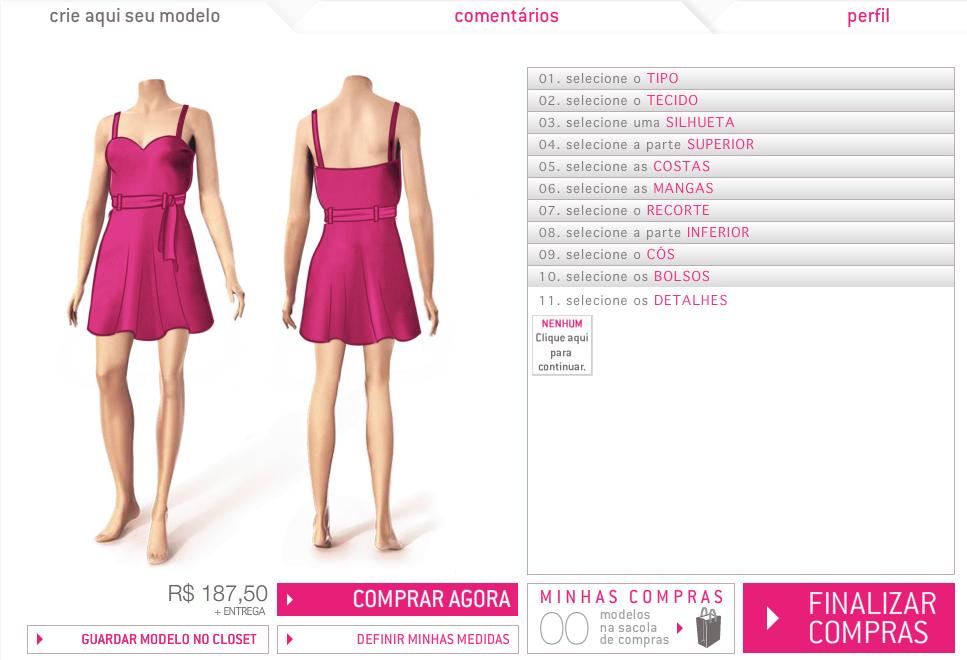 No site LACA dá pra escolher o modelo, tecido, recorte, cós e tudo mais. O site é em português, fácil de entender e à medida que as escolhas são feitas o preço do vestido é calculado. Também dá pra fazer só a saia ou só a blusa :)